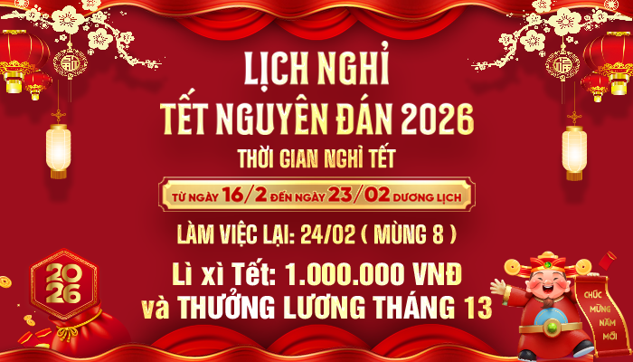 Trong thời gian nghỉ Tết, các hoạt động làm việc và hỗ trợ sẽ tạm ngưng. Mọi công việc phát sinh sẽ được xử lý ngay khi công ty hoạt động trở lại nhằm đảm bảo tiến độ chung.